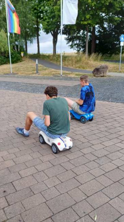 Der Donnerstag war ein herzlicher Tag. Begonnen hat der Tag nämlich mit einer Führung im Begehbaren Herzen. Dort wurde uns erklärt, wie das Herz funktioniert, wie das Blut fließt und wie man das Herz gesund halten kann. Zum Glück hatten vor der Führung noch Zeit, uns die Kinderakademie anzuschauen. Ob Spiegelkabinett oder scheinbar unmögliche Puzzle – hier konnte jeder noch etwas lernen. Nach den Lunchpaketen im nahegelegen Park ging es für uns dann Minigolf spielen. Auf 18 Bahnen konnten wir unser Fingerspitzengefühl und unsere Zielfertigkeit unter Beweis stellen. Auf der Rückfahrt wurde es dann sportlich: Nachdem der Bus uns vor der Nase weg gefahren ist dachten wir uns „Den bekommen wir noch!“ und tatsächlich - während der Bus um die Stadt gefahren ist, sind wir durchgelaufen und haben den Bus noch bekommen. So kamen wir gerade rechtzeitig zum Gottesdienst. Für diesen ist Pater John-Peter extra angereist und hat mit uns gefeiert. In diesem Jahr stand der Gottesdienst unter dem Motto Nächstenliebe, Freundschaft und Familie. Abends folgte noch ein Highlight: Das Duell um die Welt, in dem es darum ging, Challenges zu erfüllen und zu tippen, ob die Gruppenleiter ihre Aufgaben schaffen. Angelehnt an die Sendung von Joko und Klaas haben alle den Abend gespielt wie Weltmeister.