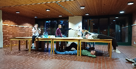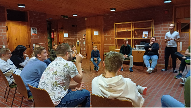 Für das restliche Abendprogramm haben Ann-Sophie und Therese eine Abendrunde à la Mini-Freizeit vorbereitet. Wir spielten das Chaosspiel, das einige schon von der Freizeit kannten. Dabei müssen die die Gruppen Codewörter, die im und um das HdB versteckt waren, suchen und den Spielleitern nennen, um eine Aufgabe zu erhalten. Wenn die Aufgabe richtig gelöst wurde, durfte die Gruppe auf dem Spielfeld nach vorne rücken. Bei einer nichtgelösten Aufgabe rückte man wieder nach hinten. Bei dem Spiel ging es aber nicht nur um Schnelligkeit, sondern auch um Würfelglück, um möglichst schnell vorwärts zu kommen. Die Gruppe, die am schnellsten das Ziel erreicht hat, hat gewonnen.