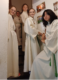 In seiner Festrede hieß unsere Ausbildungsleitung Markus die vier nicht nur offiziell als Messdiener*innen in unserer Gemeinschaft Willkommen. Er sprach auch ein großes Dankeschön an die Vertrauensgruppenleiter*innen Hannah, Julia und Leander aus. Sie haben in all den Ausbildungstreffen und Gruppenstunden unsere neuen Minis bestmöglich auf den Dienst am Altar vorbereitet.