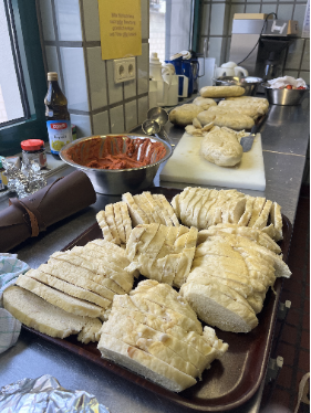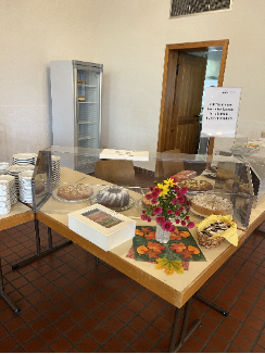 Bereits am Vortag des Gemeindecafés liefen die Vorbereitungen auf Hochtouren; schließlich mussten die Zutaten in ausreichendem Maße besorgt und das Essen so gut wie möglich vorgekocht werden, damit am nächsten Tag die Arbeitslast geringer ausfällt für die anwesenden Gruppenleiter*innen. Sonntagmorgen ging es dann so richtig los: der Saal im Obergeschoss des HdB wurde hergerichtet und dekoriert, Kuchen angeschnitten, Getränke kalt gestellt. Es sollte nicht lange dauern, bis die ersten neugierigen (und vor allem hungrigen) Gesichter sich ins Haus der Begegnung gesellten und nach einer erfolgreichen Ansprache im Gottesdienst war der Saal mehr als gut gefüllt. Da hatten die Gruppenleiter*innen alle Hände voll zutun, aber dank Teamwork sowie einem clever ausgefeilten Kassensystem konnte der Überblick behalten werden. Am Ende des Tages waren alle geschafft, aber auch glücklich, dass wir dieses Jahr wieder ein so schönes Gemeindecafé mit viel Anklang auf die Beine stellen konnten – es freut uns, dass auch einige Gruppenkinder da waren und dass es allen sehr gut geschmeckt hat :).